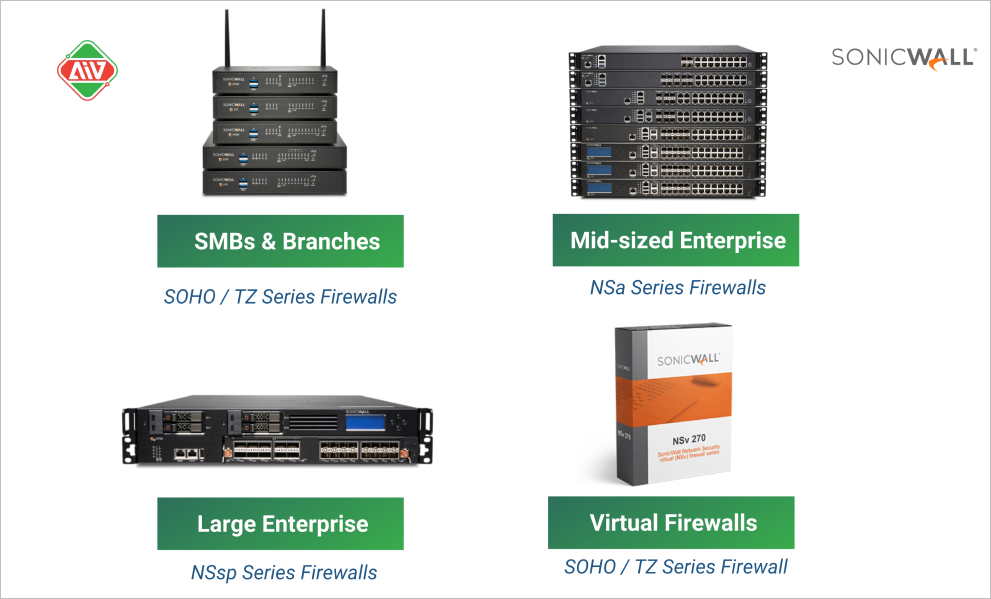 SonicWall có nhiều dòng sản phẩm khác nhau phù hợp cho các doanh nghiệp có quy mô khác nhau, từ cỡ nhỏ, cỡ vừa đến các tập đoàn lớn. Dưới đây là một số sản phẩm tường lửa của SonicWall mà AI Việt cung cấp: